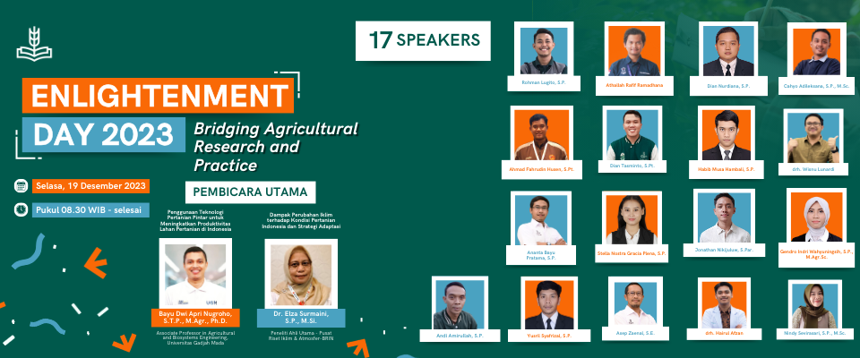 Acara utama diisi oleh Dr. Elza Surmaini, S.P., M.Si. (Peneliti Ahli Utama – Pusat Riset Iklim & Atmosfer BRIN) dan Bayu Dwi Apri Nugroho, S.T.P., M.Agr., Ph.D. (Associate Professor in agricultural and Biosystems Engineering, Universitas Gadjah Mada) membahas penerapan teknologi pertanian yang tepat untuk kondisi di Indonesia masa kini.